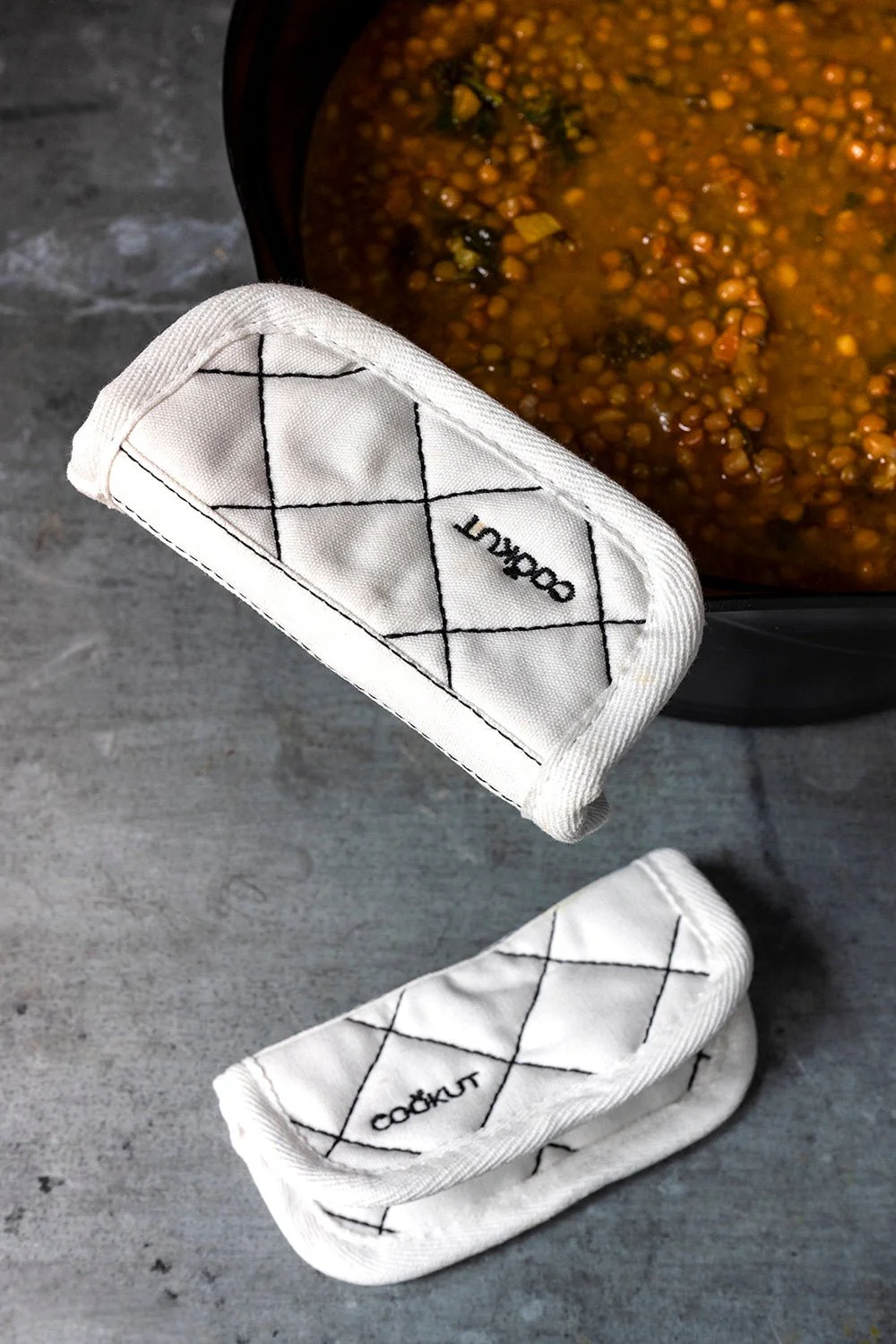 Agarradores de algodón para poder sujetar las cocotte y proteger las manos del calor que estas puedan desprender, ya que debido al material con el que está fabricado estas ollas, el calor se reparte uniformemente por toda la olla.