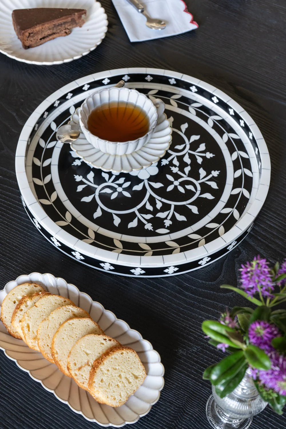 Bandeja de resina redonda con diseño de flores blancas y negras, elaborada con patrones únicos y fabricada de manera artesanal, convirtiéndola en una pieza única que combina perfectamente con cualquier decoración o mesa. Estas piezas están diseñadas y pulidas de tal forma que su acabado permanece como el primer día durante mucho tiempo.