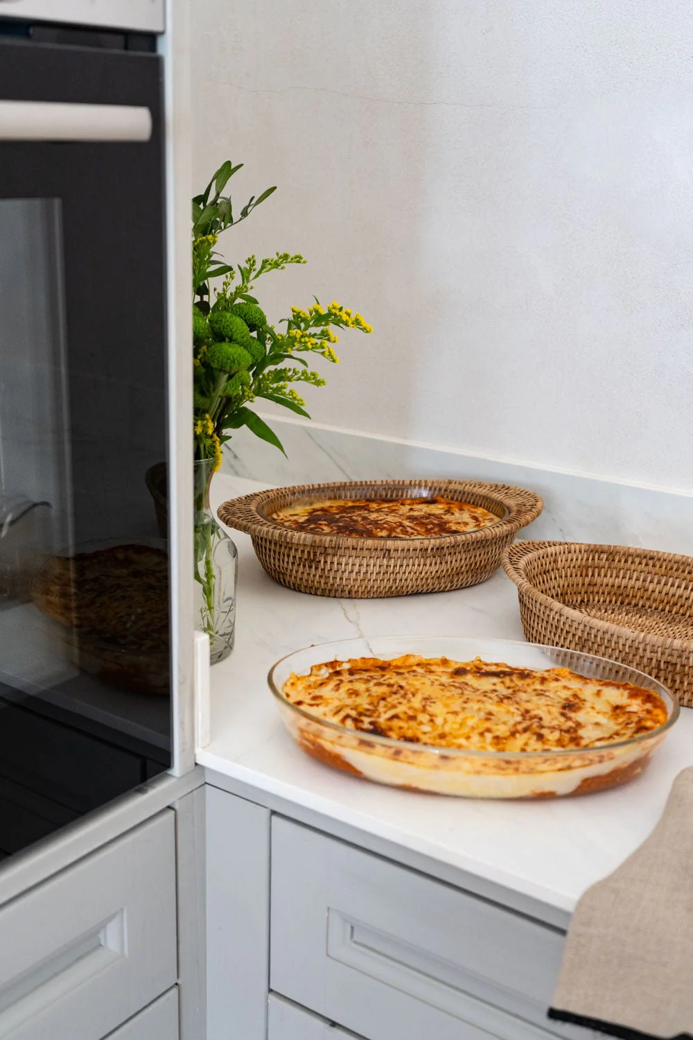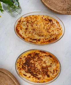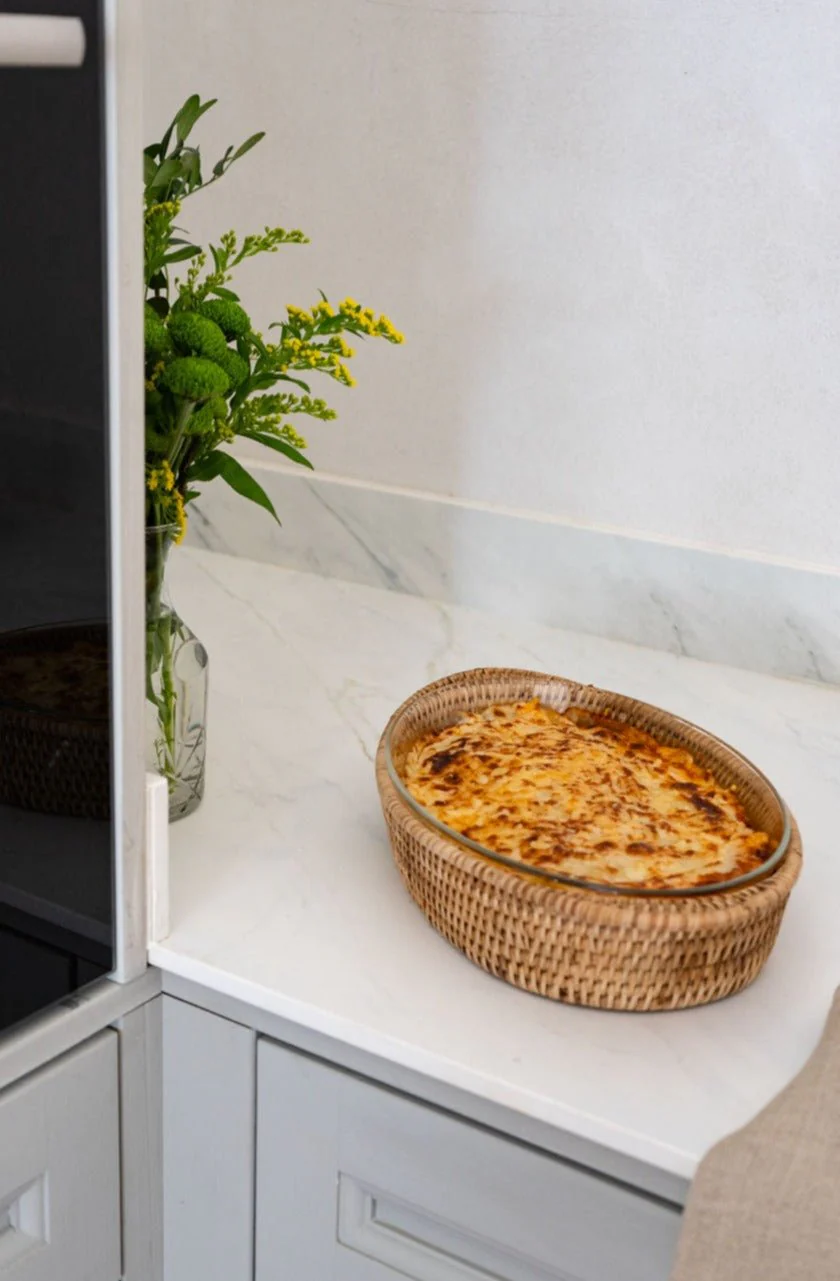 Bandeja ovalada grande de ratán con pírex, ideal para servir con estilo tus platos favoritos, gracias a su resistencia y estilo único. Esta colección combina la belleza del material natural con la funcionalidad y el diseño contemporáneo.