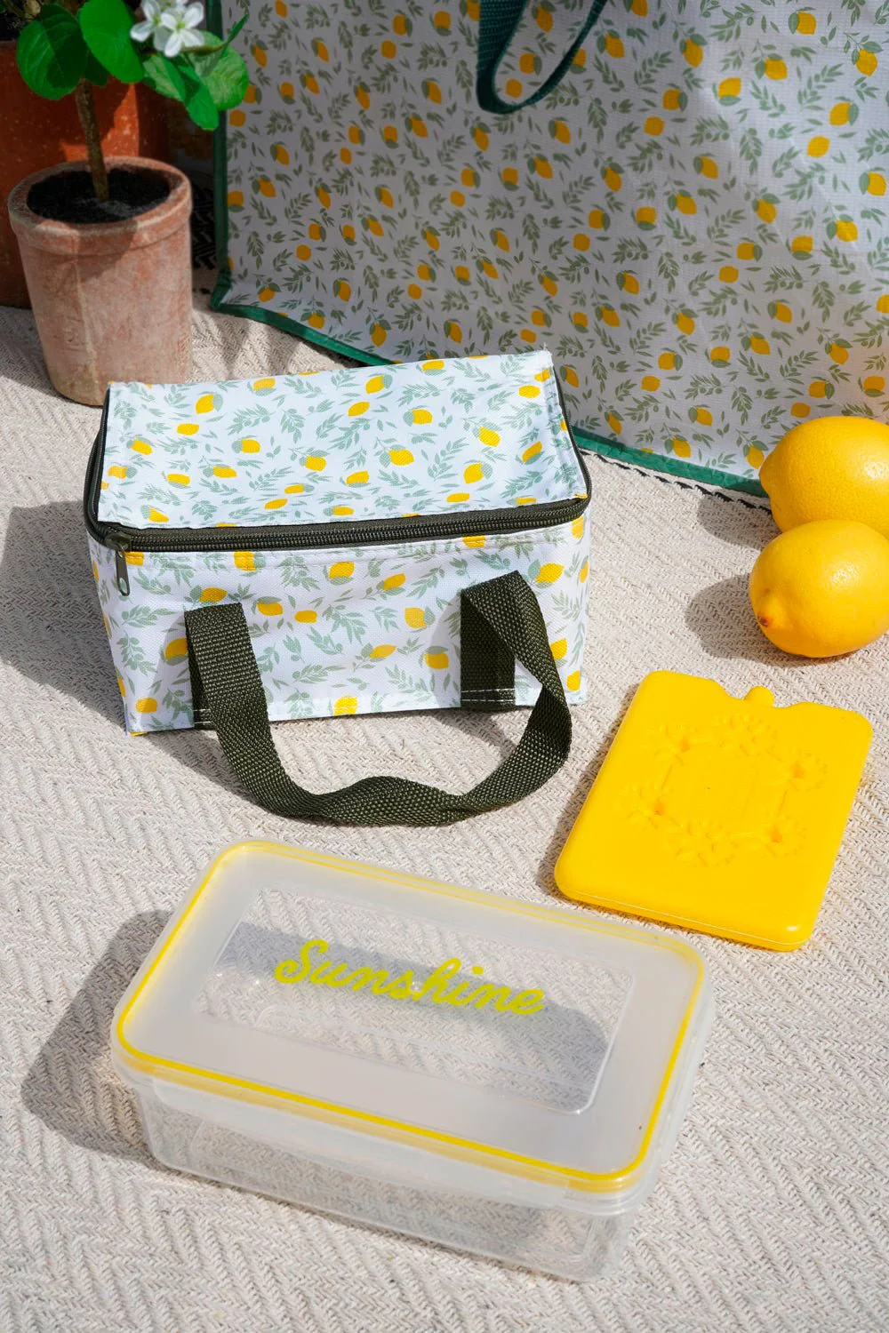 Bolsa térmica con diseño de limones y asas para colgar fácilmente, perfecta para mantener la comida y bebidas frías o calientes, gracias a que su forro interior está hecho de papel de aluminio de calidad.