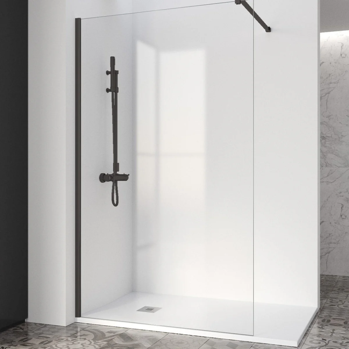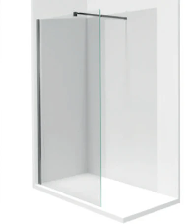 Mampara de un sólo cristal, transparente y fijo, con un perfil a pared y un brazo de sujeción, en aluminio negro mate. 60-160 X 200(h) cm.