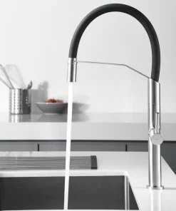 Grifería de cocina monomando extraíble mod. BERNA, cuerpo grifería en latón acabado oro cepillado, cartucho monomando de 35mm. apertura en frío, difusor con doble jet. Incluiye latiguillos 50cms.