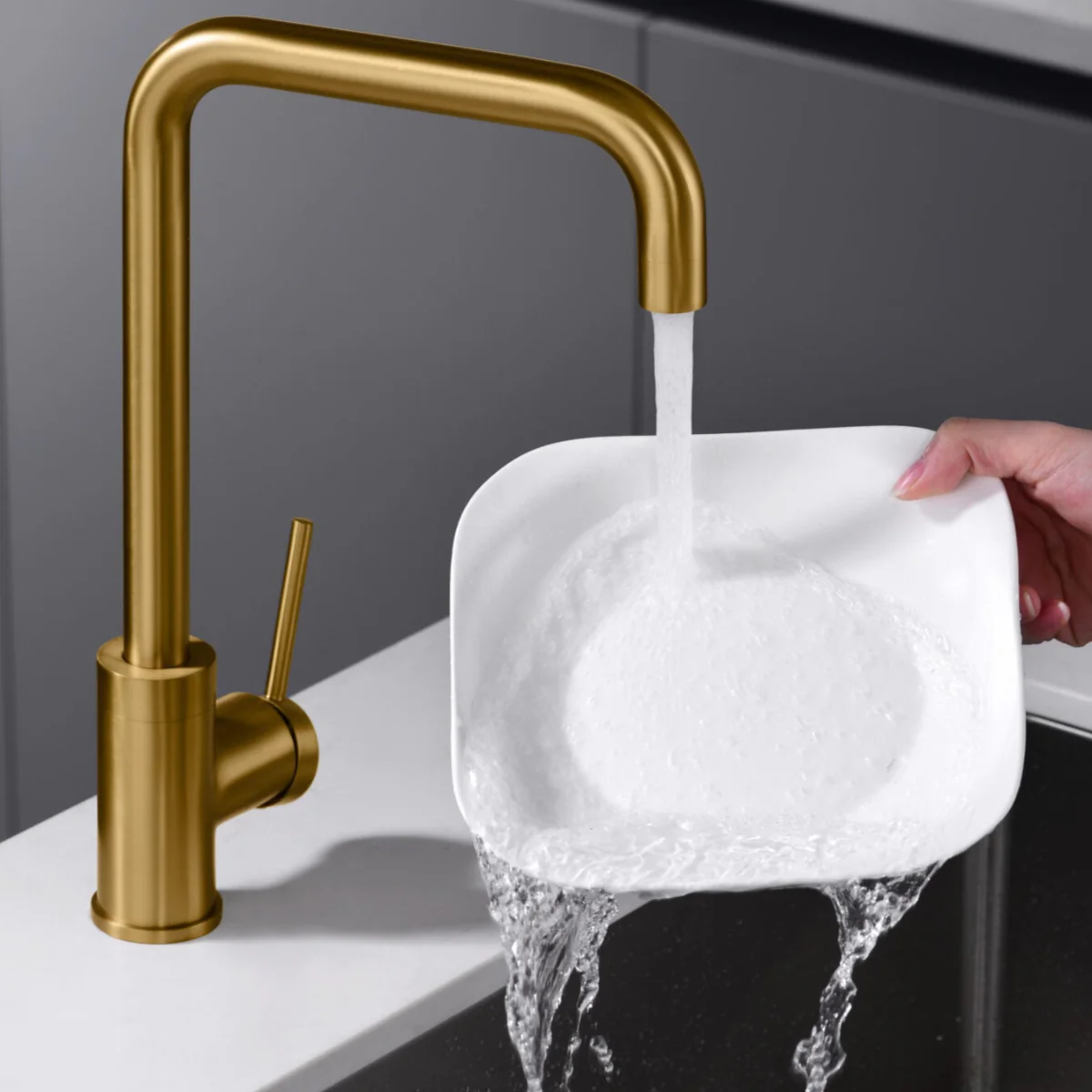 Grifería de cocina monomando mod. LOIRA, cuerpo grifería en latón acabado oro cepillado, cartucho monomando de 35mm. Incluye latiguillos 50cms.