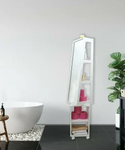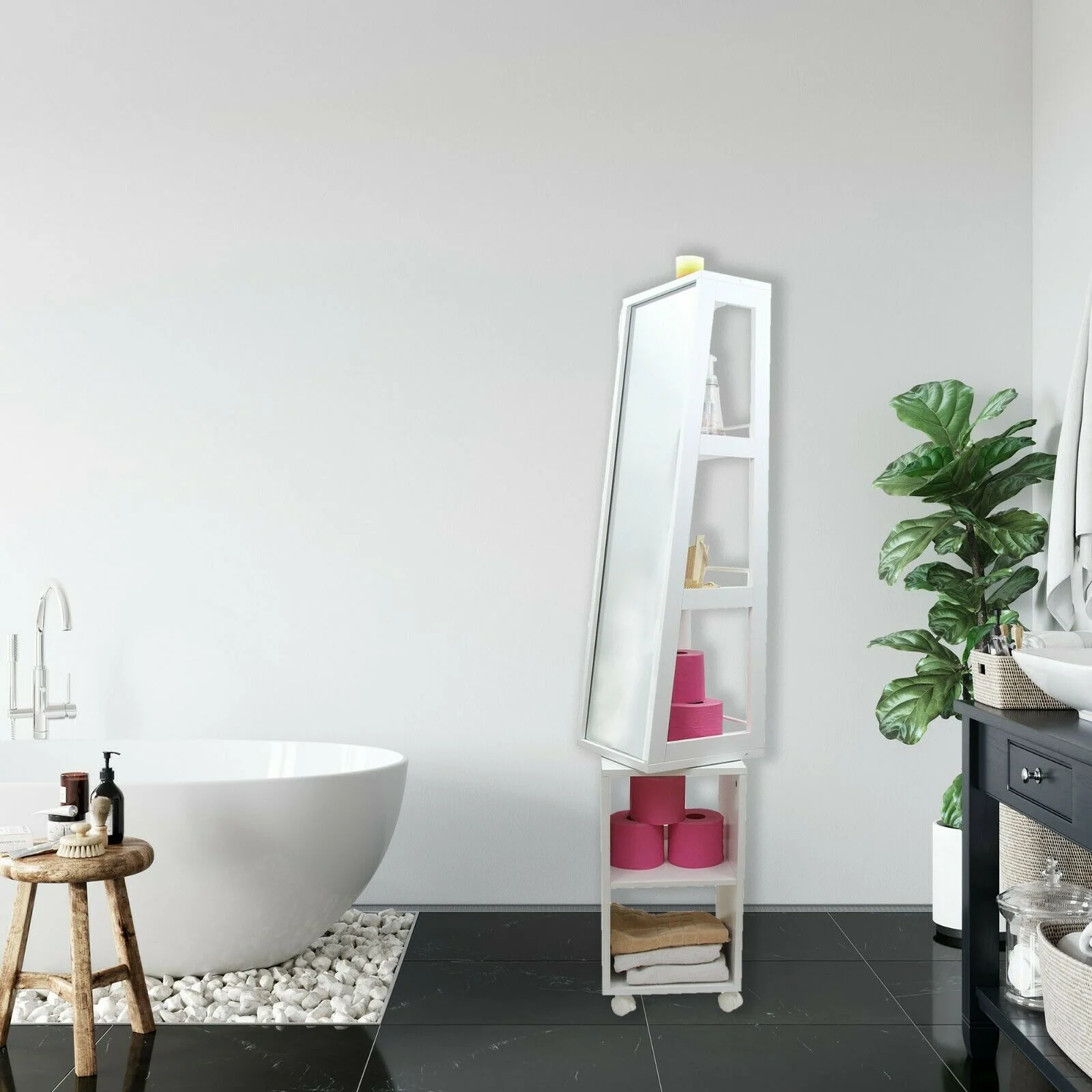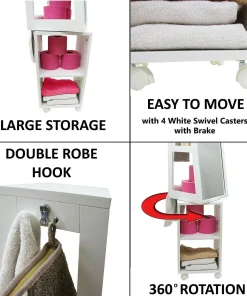 Mueble de Baño Columna Armario Giratorio Con Ruedas con Espejo 3 Conpartimentos 2 Estantes, Armario de Lavabo