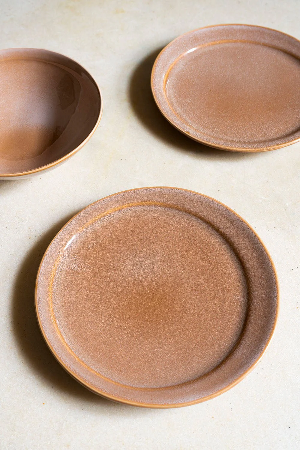 Plato de postre de gres con diseño ligeramente irregular y estilo artesanal.
