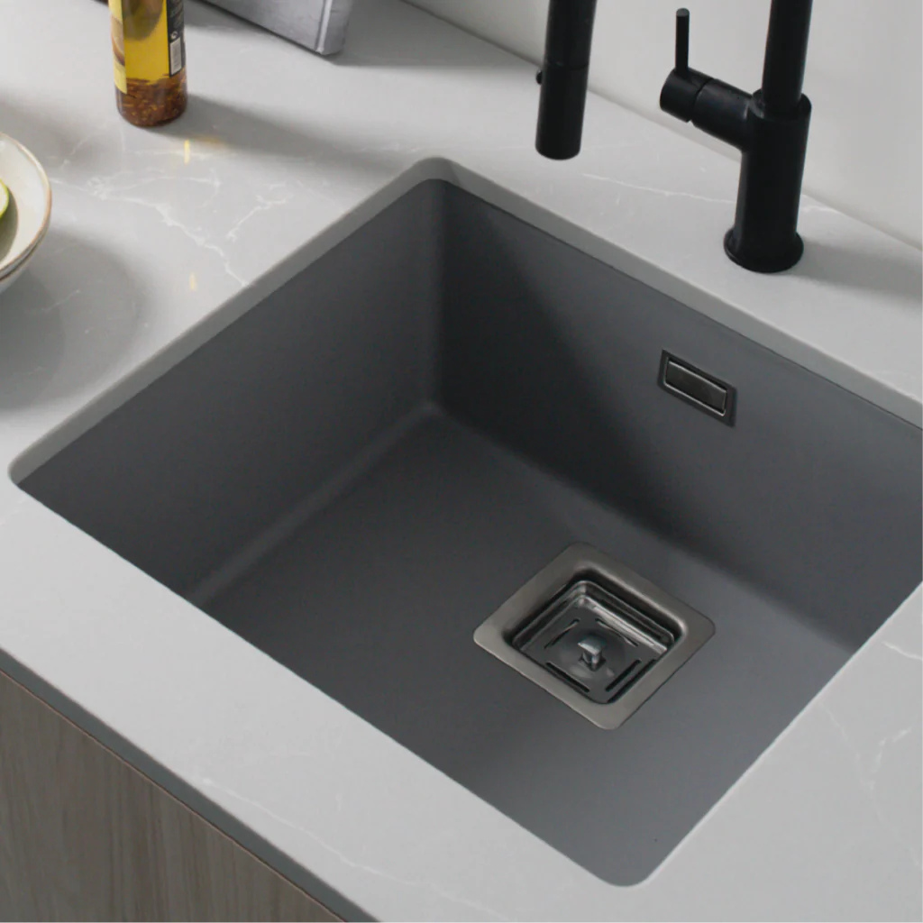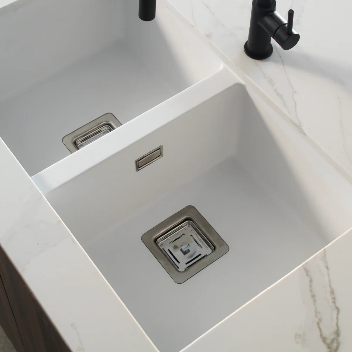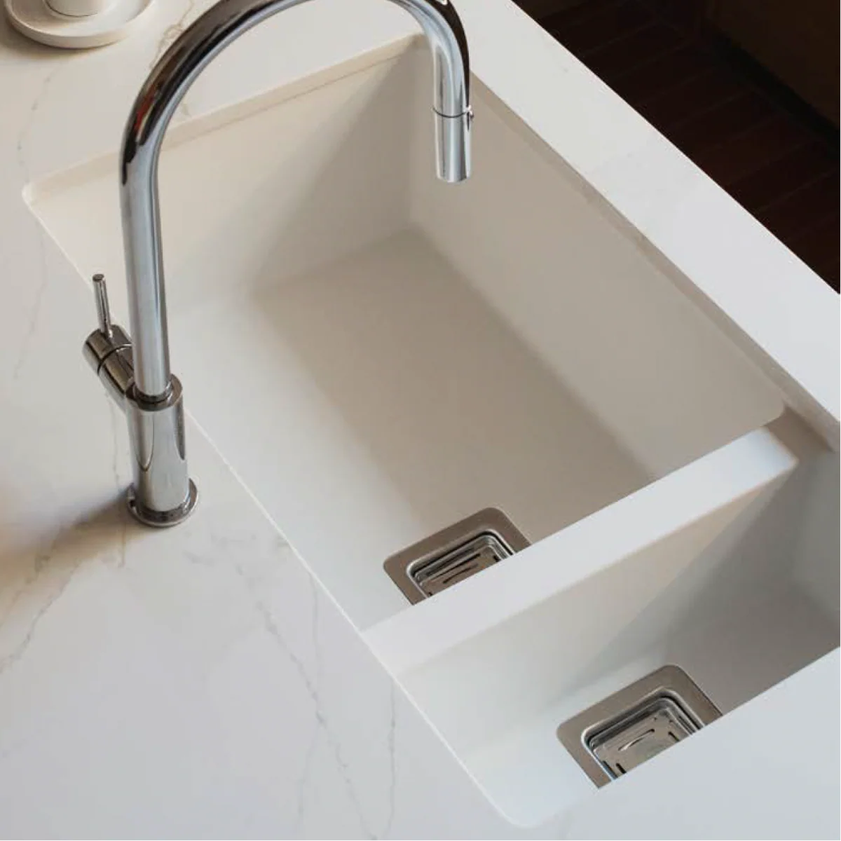 La colección de fregaderos ZIE de POALGI, ofrece la posiblidad de encastrarlo tanto BAJO ENCIMERA, como SOBRE ENCIMERA. Fabricado en material RocStone, con acabado Soft, que es un mate discreto y elegante.