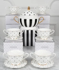 Este set tanto para cuatro como para seis personas incluye las piezas esenciales de nuestra clásica vajilla negra y blanca para servir el té en tu mesa tanto en desayunos como en meriendas.