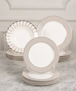 Los productos que incluyen este set son de New Bone China, reconocida por ser muy fina, ligera y resistente. Con nuestros emblemáticos colores “blanco y gris” y con un delicado filo dorado decorando, que le dará a tu mesa el toque elegante que estabas buscando.