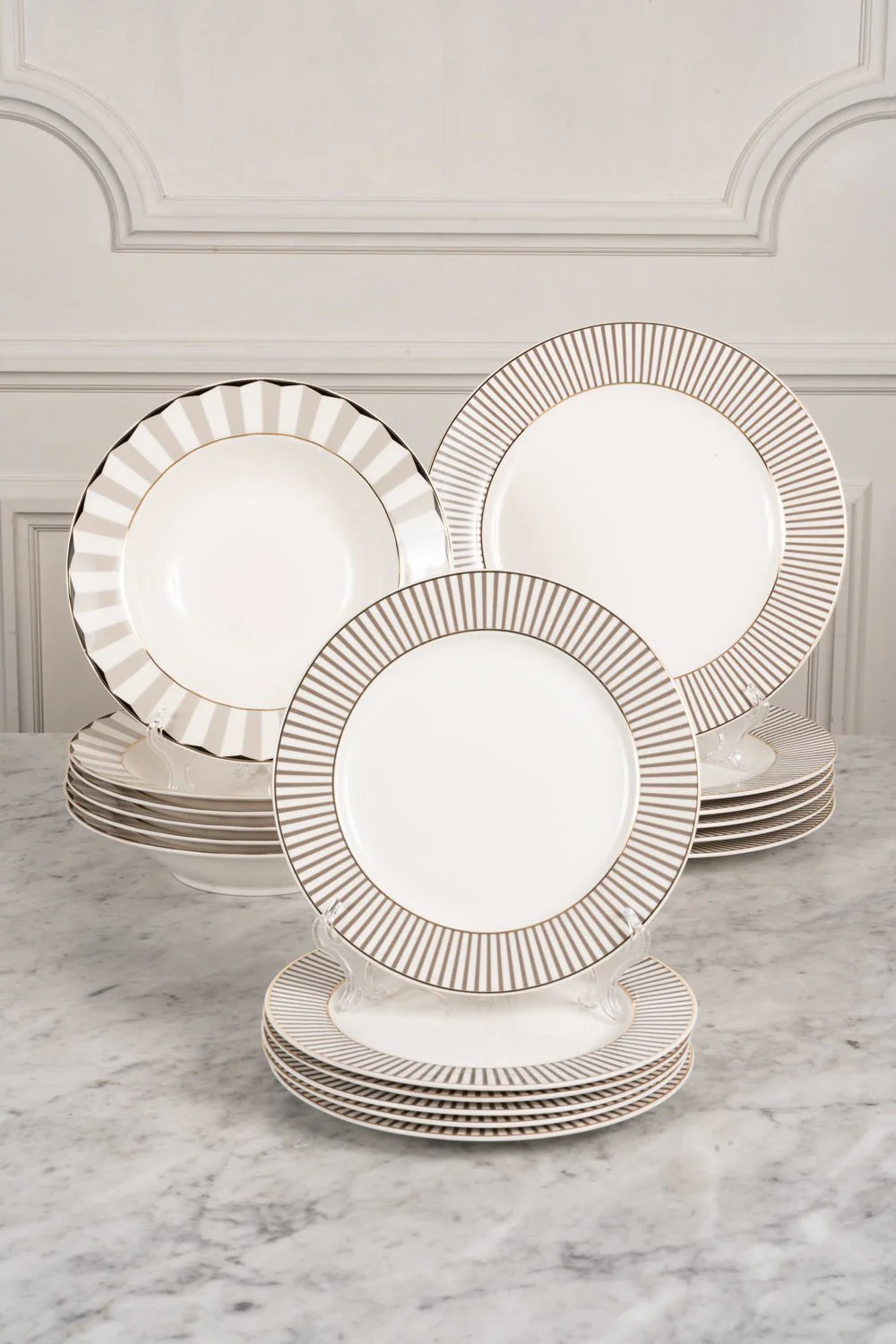 – 6 platos llanos rayas blanco y gris CO