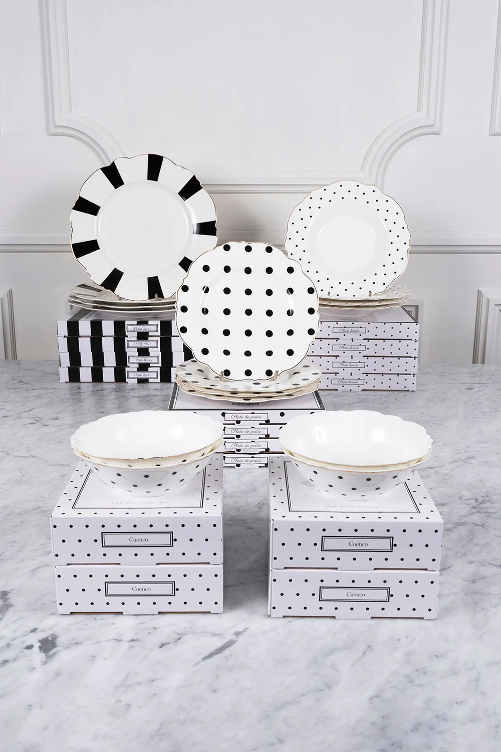 Los productos que incluyen este set son de New Bone China, reconocida por ser muy fina, ligera y resistente. Con nuestros emblemáticos colores “blanco y negro” y con un delicado filo dorado decorando, que le dará a tu mesa el toque elegante que estabas buscando.