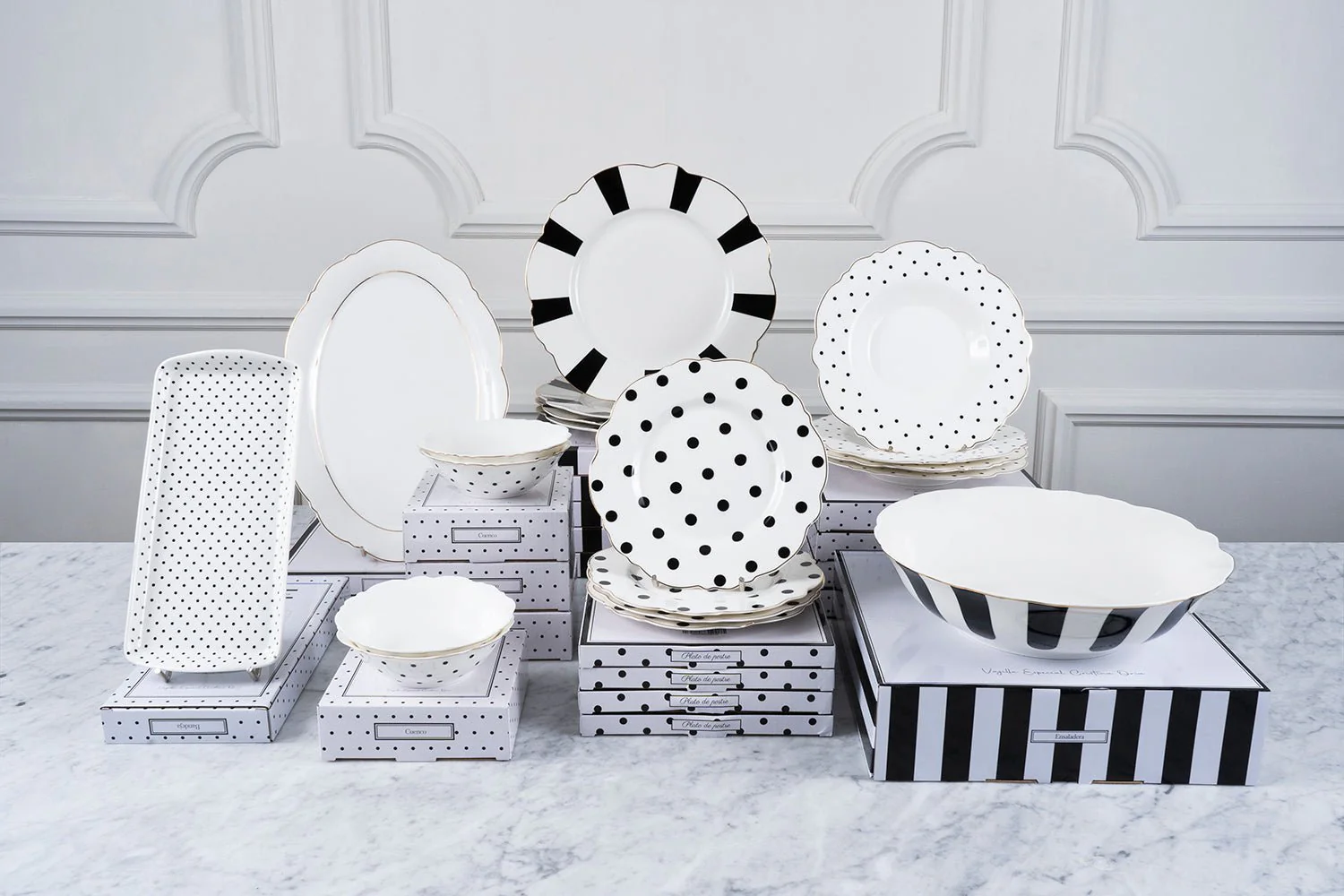 Este set tanto para cuatro como para seis personas es una de nuestras opciones más completas de nuestra clásica vajilla blanca y negra.