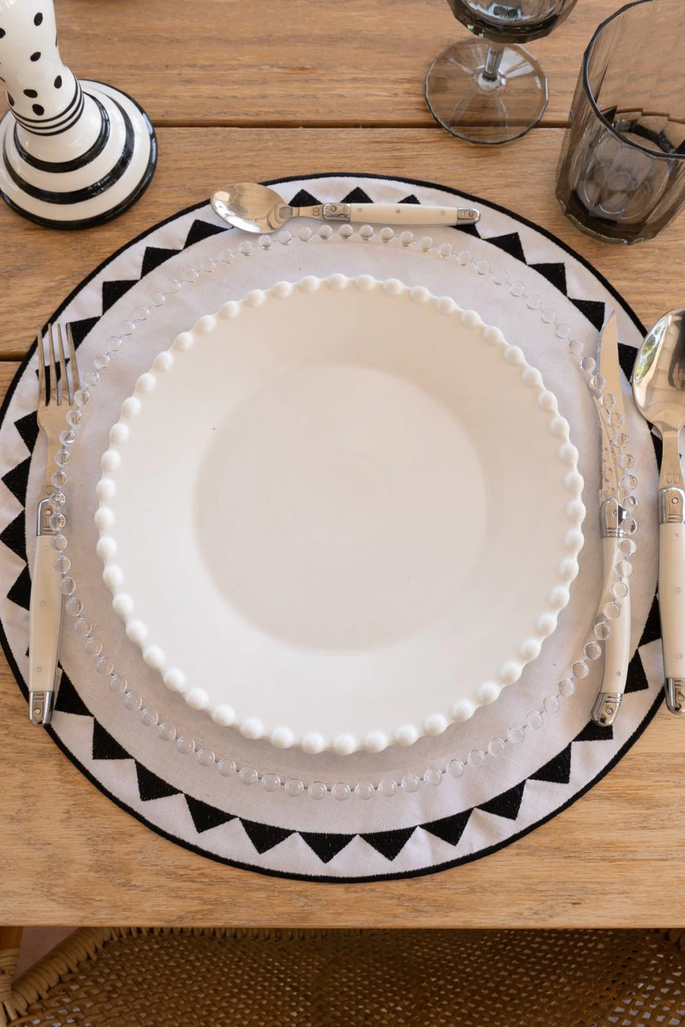 Esta elegante vajilla de porcelana blanca destaca por su diseño clásico con un toque distintivo: un delicado borde decorado con un patrón de pequeñas bolitas en relieve que aportan textura y estilo. Su diseño atemporal combina fácilmente con cualquier estilo de mesa, desde lo más tradicional hasta lo moderno. Perfecta tanto para ocasiones especiales como para el uso diario.